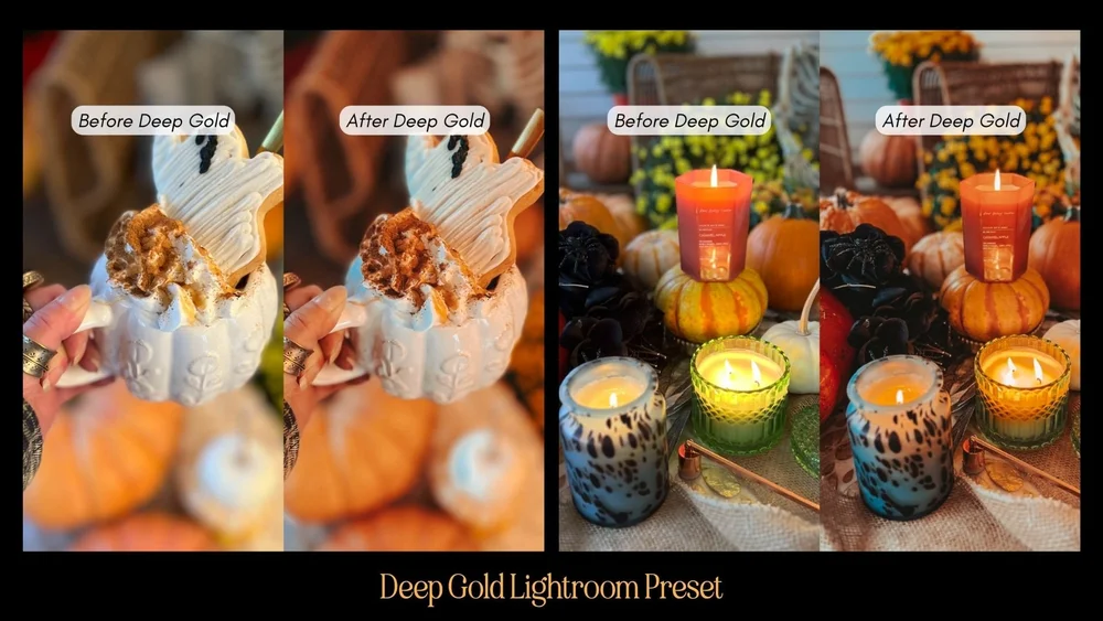 Deep Gold is a professional Lightroom preset that gives images a warm, moody, golden autumn glow in one click—perfect for lifestyle, beauty, home, and product photos.